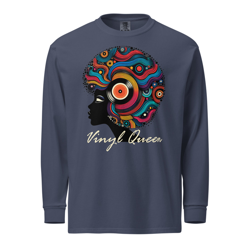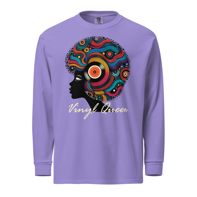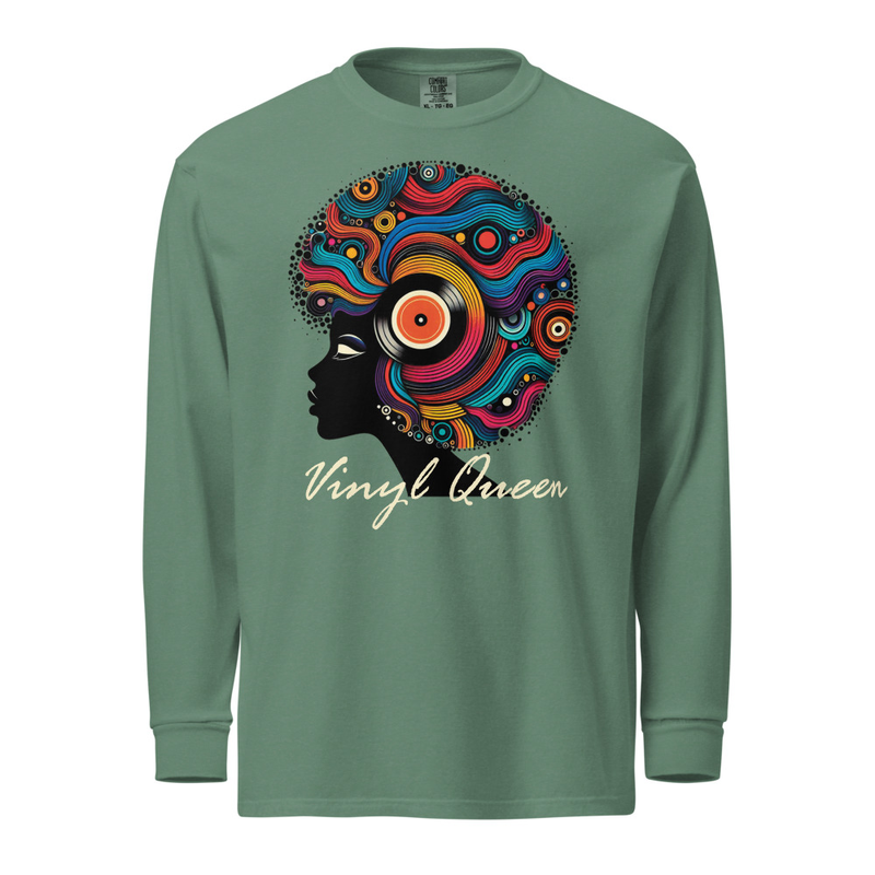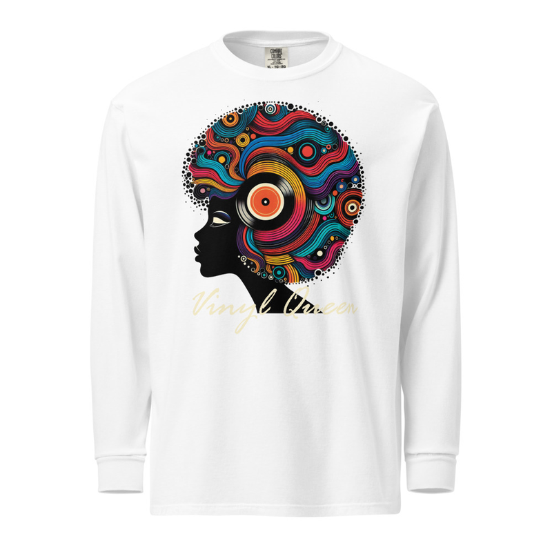 Fashion & ApparelWrap yourself in the warmth of retro vibes and musical royalty with our Vinyl Queen Record Hair Long-sleeve Shirt! This cozy Long-sleeve tee features a striking silhouette of a woman with vibrant, swirling hair that seamlessly incorporates a vinyl record, blending vintage charm with modern artistic flair.